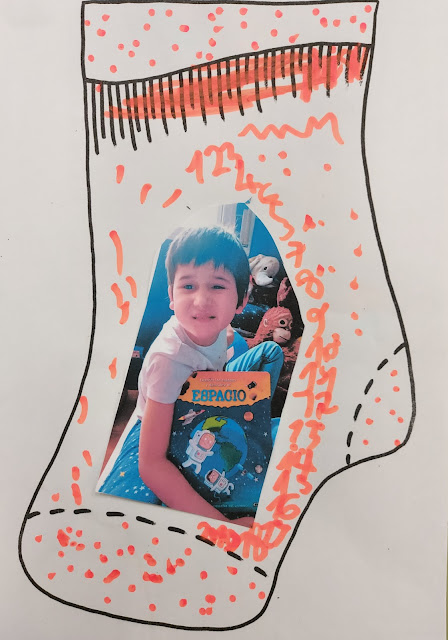 Todas estas "prendas" aportadas por los niños y niñas de la clase, junto a las de las demás aulas de primer ciclo, ya han empezado a tenderse por los múltiples tendederos que MERCHE, la maestra responsable de la biblioteca, ha dispuesto por los techos del edificio.